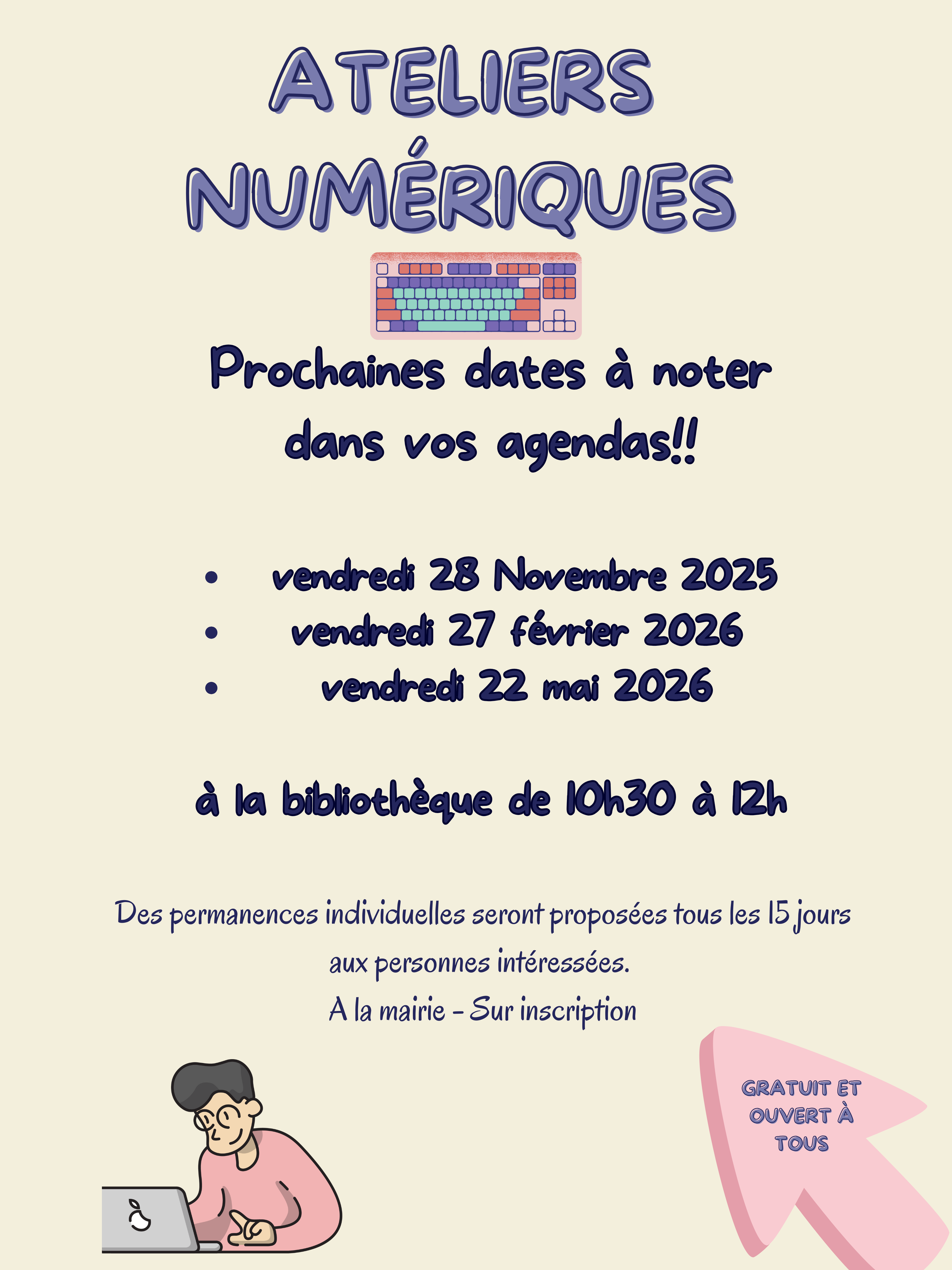 Nouveauté: Des permanences individuelles d'1h, pilotées par Manuel LOPEZ - conseiller numérique- sont proposées à partir du 12 décembre prochain les vendredi matins à la mairie.
